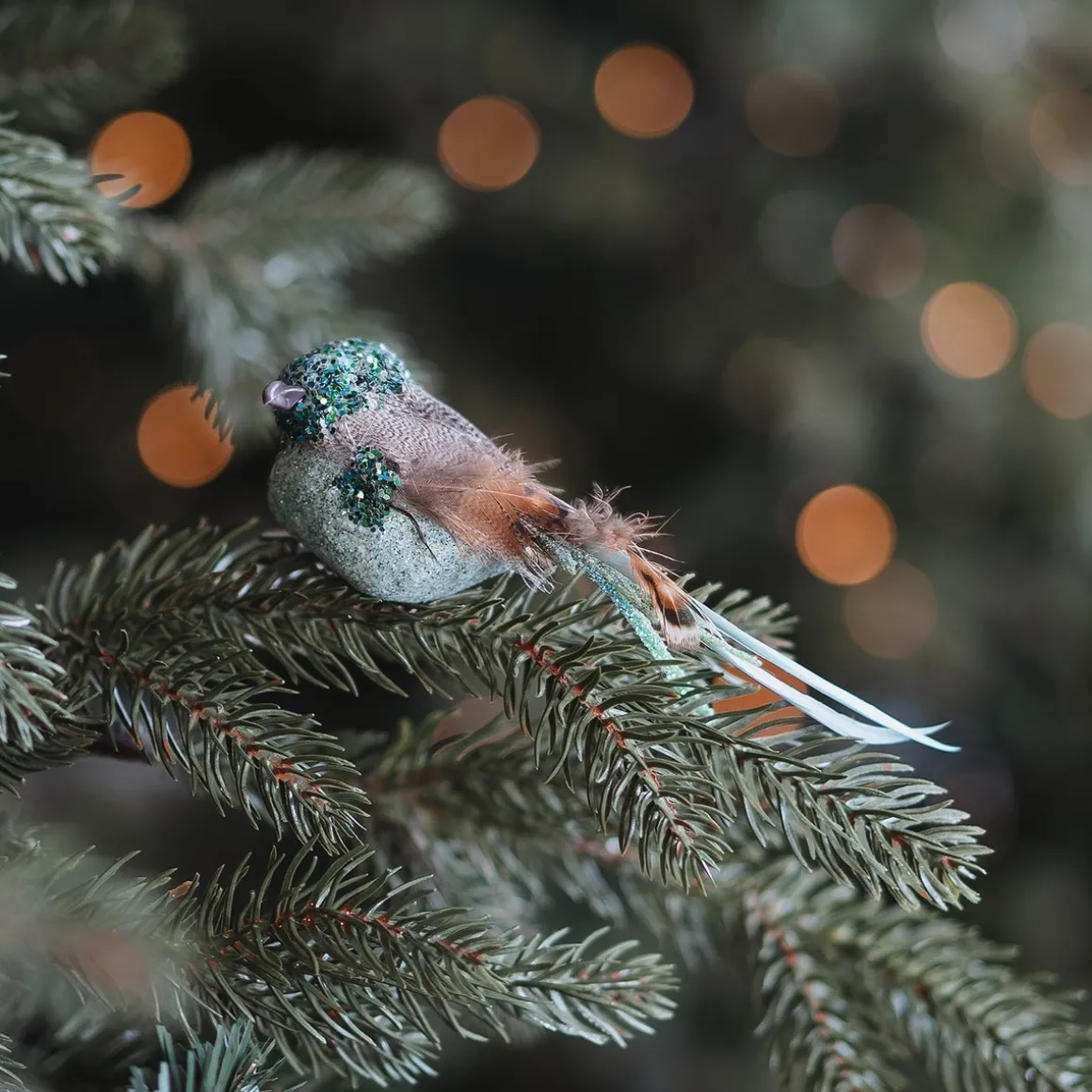 Deze vogel op clip in een prachtige teal kleur voegt een vleugje betovering toe aan je kerstdecoratie. Het kopje is versierd met sprankelende glitters, waardoor het opvalt en schittert. De staart is versierd met glitters en verfraaid met echte veren, wat een elegante uitstraling geeft. Deze vogel van 16 cm is niet alleen perfect in de kerstboom, maar ook op de tafel, geplaatst in een vaas samen met ballen voor een feestelijk accent, of los op een tak in een vaas voor een stijlvolle en opvallende presentatie.