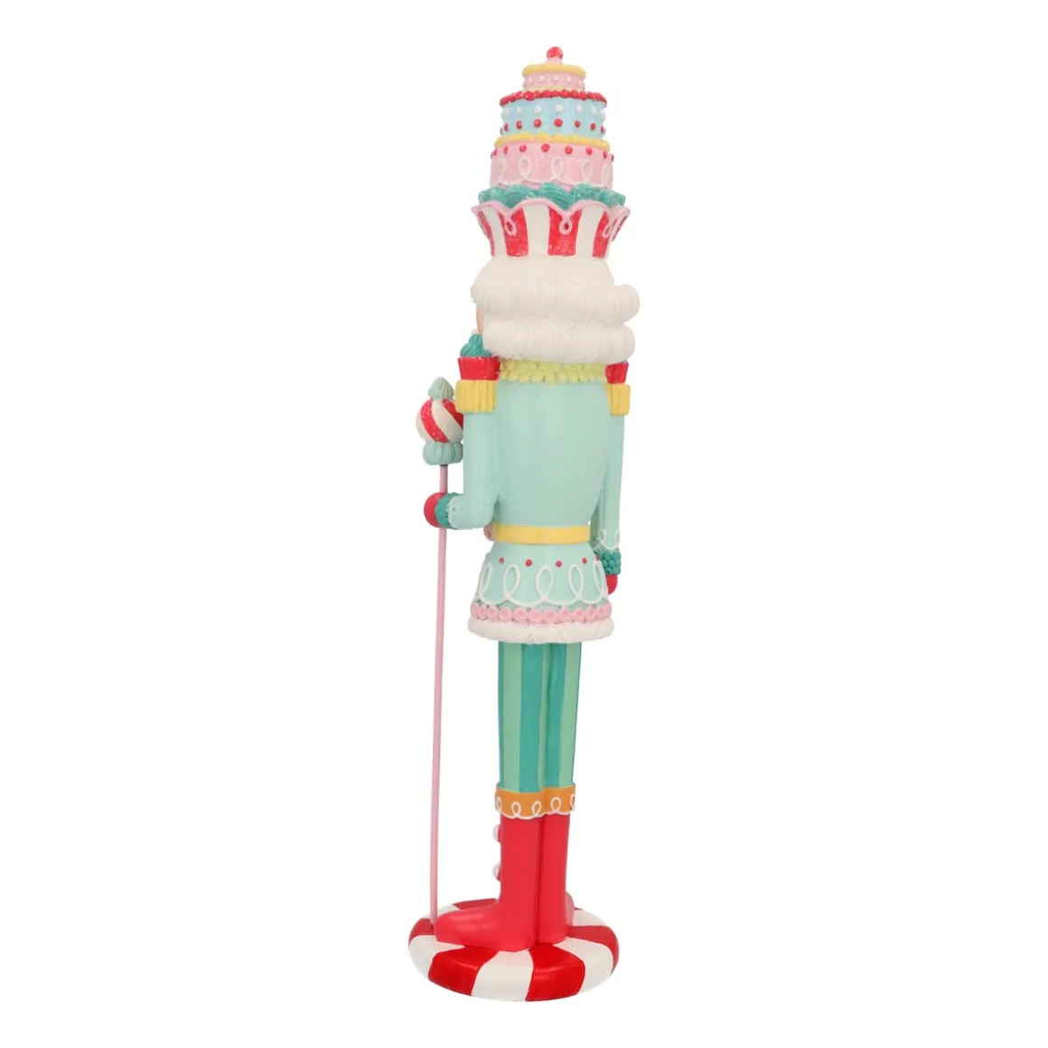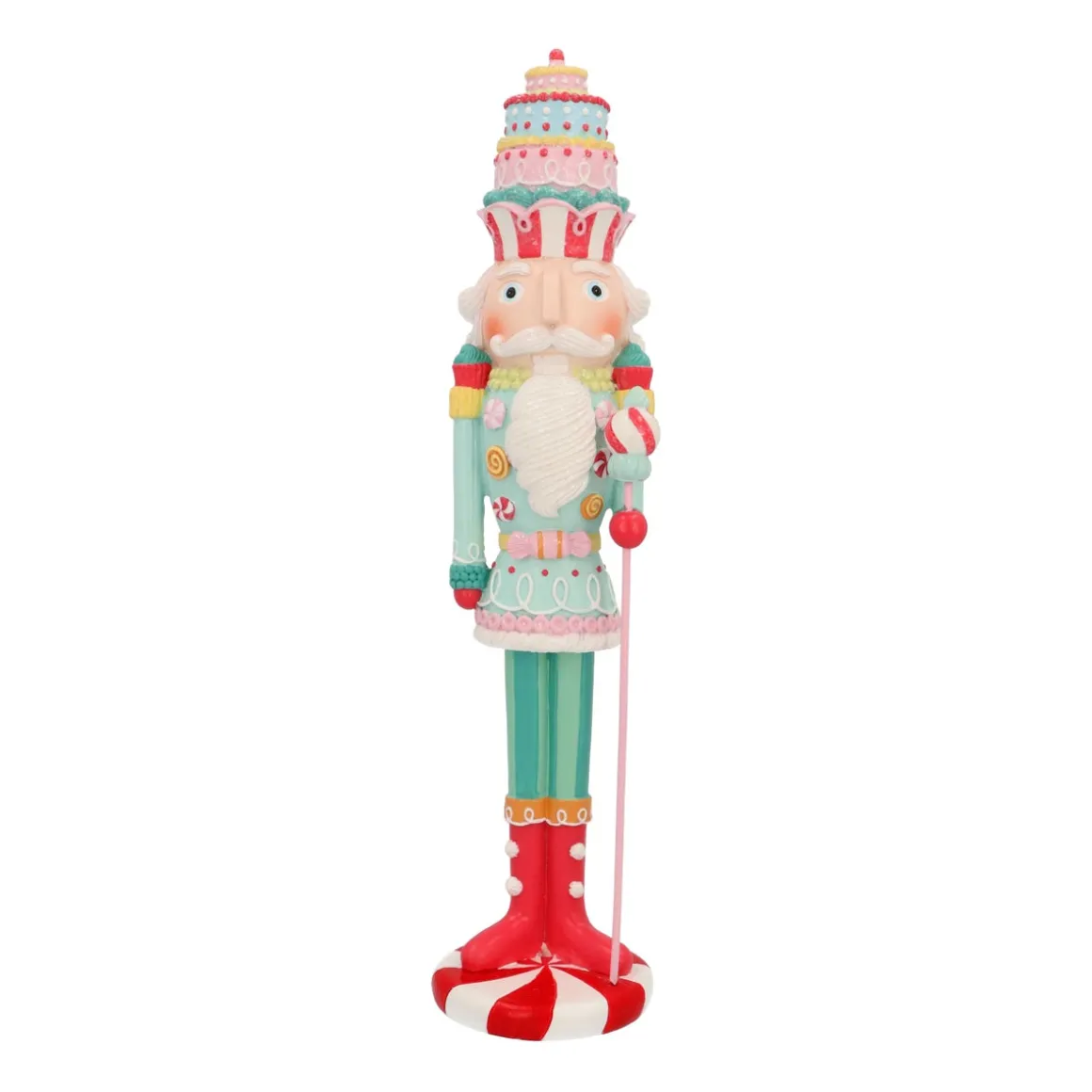 Deze pastelkleurige notenkraker is er eentje om vrolijk van te worden! Hij is 35 cm groot, gemaakt van stevig polyresin en besprenkeld met een suikercoating. Met zijn cupcake-hoed vol snoepjes, versierde stok en een lichtblauwe jas, is hij zeker geen normale notenkraker. De roze laarzen, taart op zijn hoofd en cupcake-schoudervullingen maken zijn outfit helemaal af. Van de slagroompatronen tot de suikersnoepjes en de cupcakes, deze notenkraker is een echte zoetekauw! Met zijn zachte pastelkleuren zoals roze, lichtblauw en mintgroen fleurt hij jouw kamer op zonder overdreven aanwezig te zijn. Hij houdt trots zijn stok vast, klaar om jouw kerstinterieur te bewaken.
