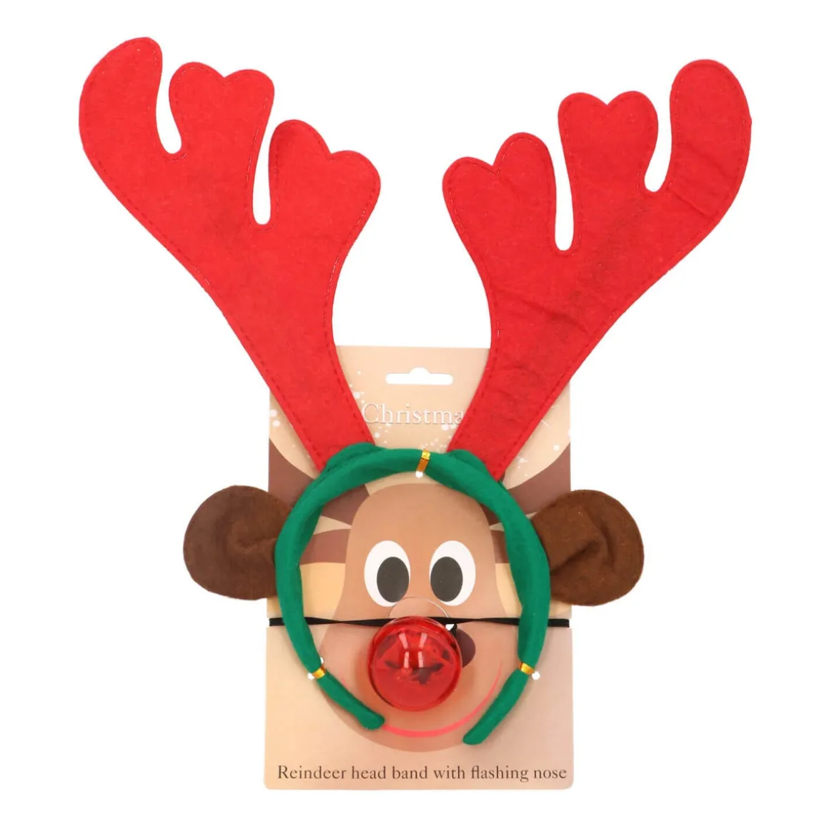 Rendierset met diadeem en neus, voor volwassenen. Op het diadeem zit een gewei en twee oren. In de neus zit een lichtje. Tovert direct een glimlach op de gezichten.