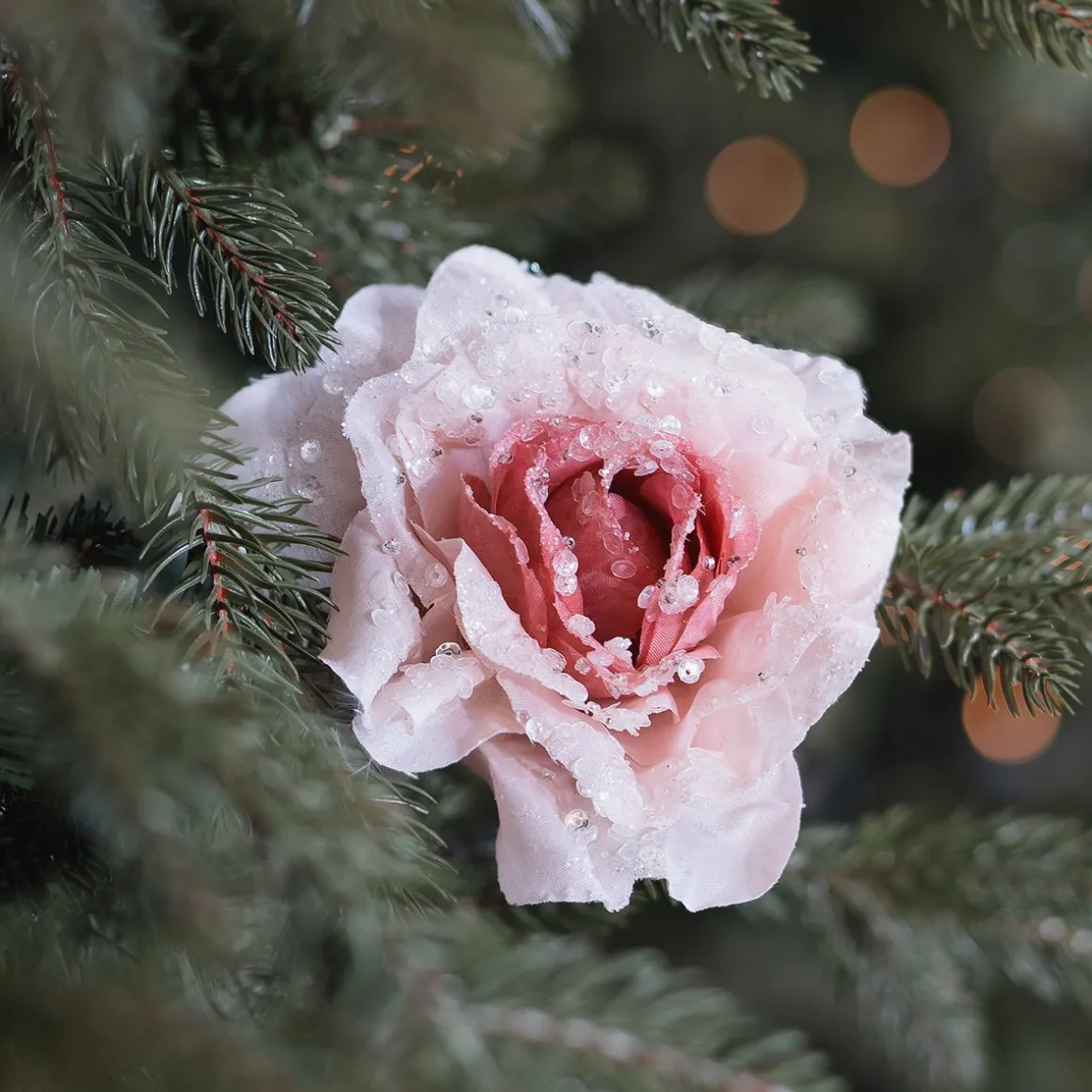 Decoratieve oudroze roos op clip, met een doorsnede van ongeveer 12 cm. Voorzien van glitters. Door het klemmetje eenvoudig te bevestigen in bijvoorbeeld de kerstboom.