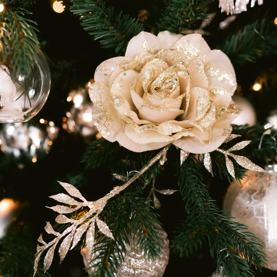 Decoratieve taupekleurige roos op clip, met een doorsnede van ongeveer 12 cm. Voorzien van glitters. Door het klemmetje eenvoudig te bevestigen in bijvoorbeeld de kerstboom.