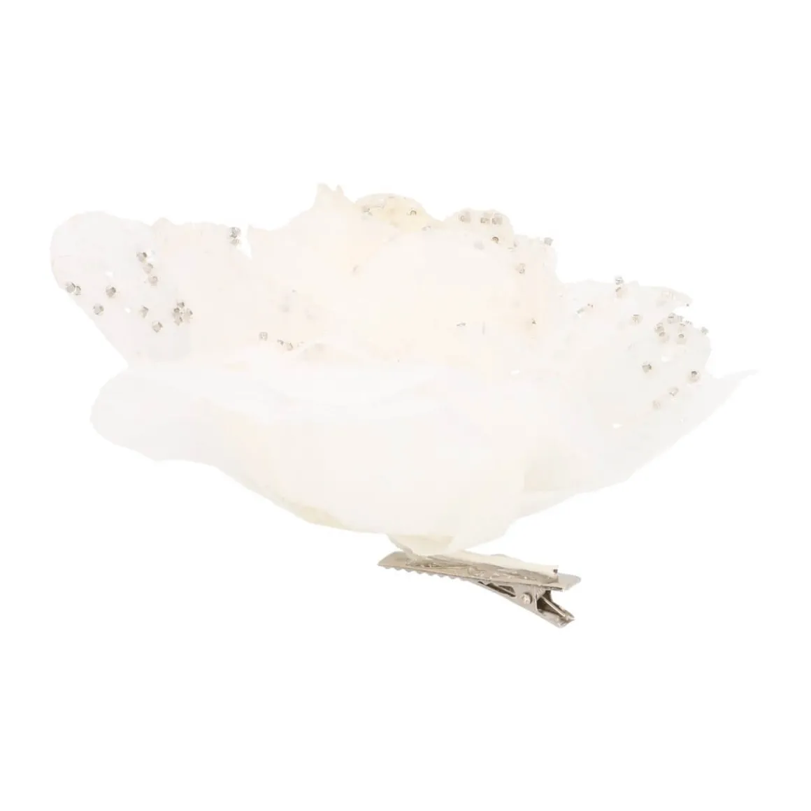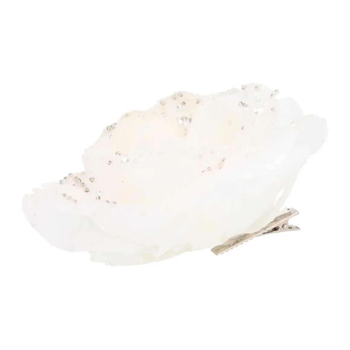 Decoratieve witte roos op clip, met een doorsnede van ongeveer 12 cm. Voorzien van glitters. Door het klemmetje eenvoudig te bevestigen in bijvoorbeeld de kerstboom.
