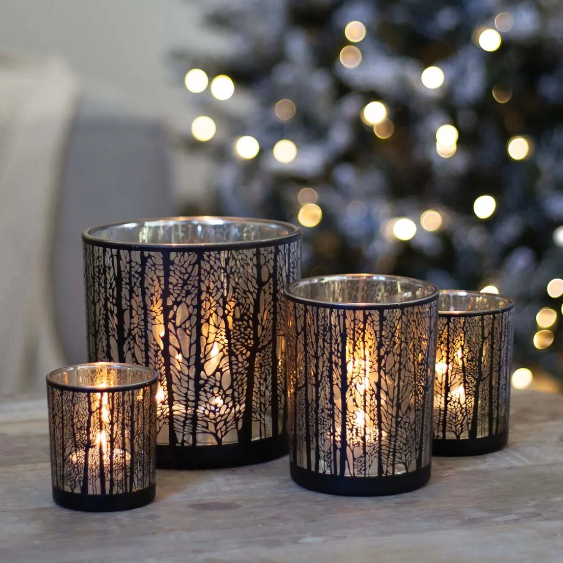 Het patroon van bomen is aan de binnenkant van deze waxinelichthouder goud, de buitenkant is stijlvol zwart.
