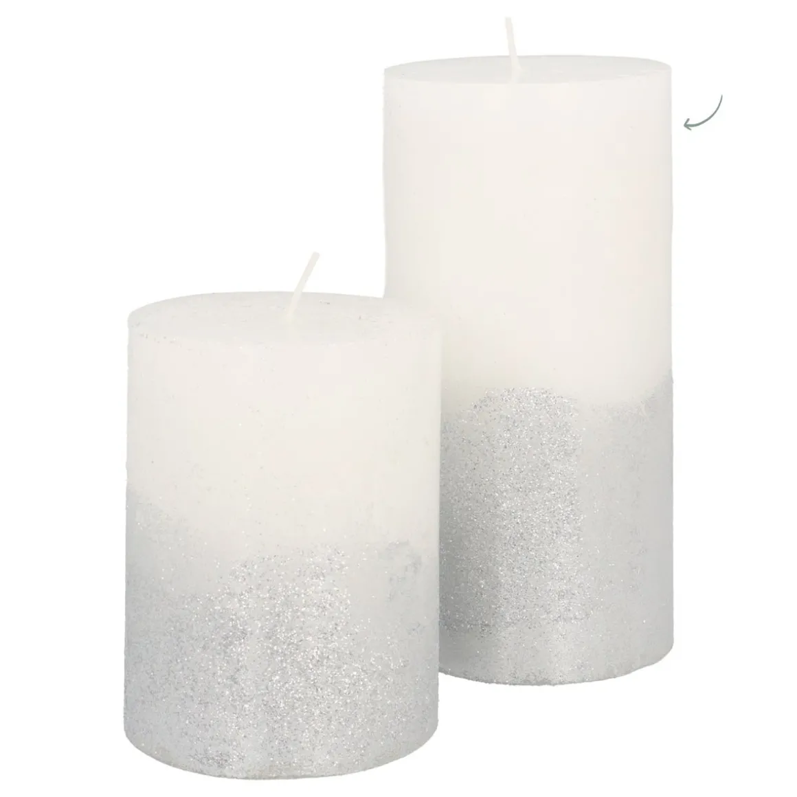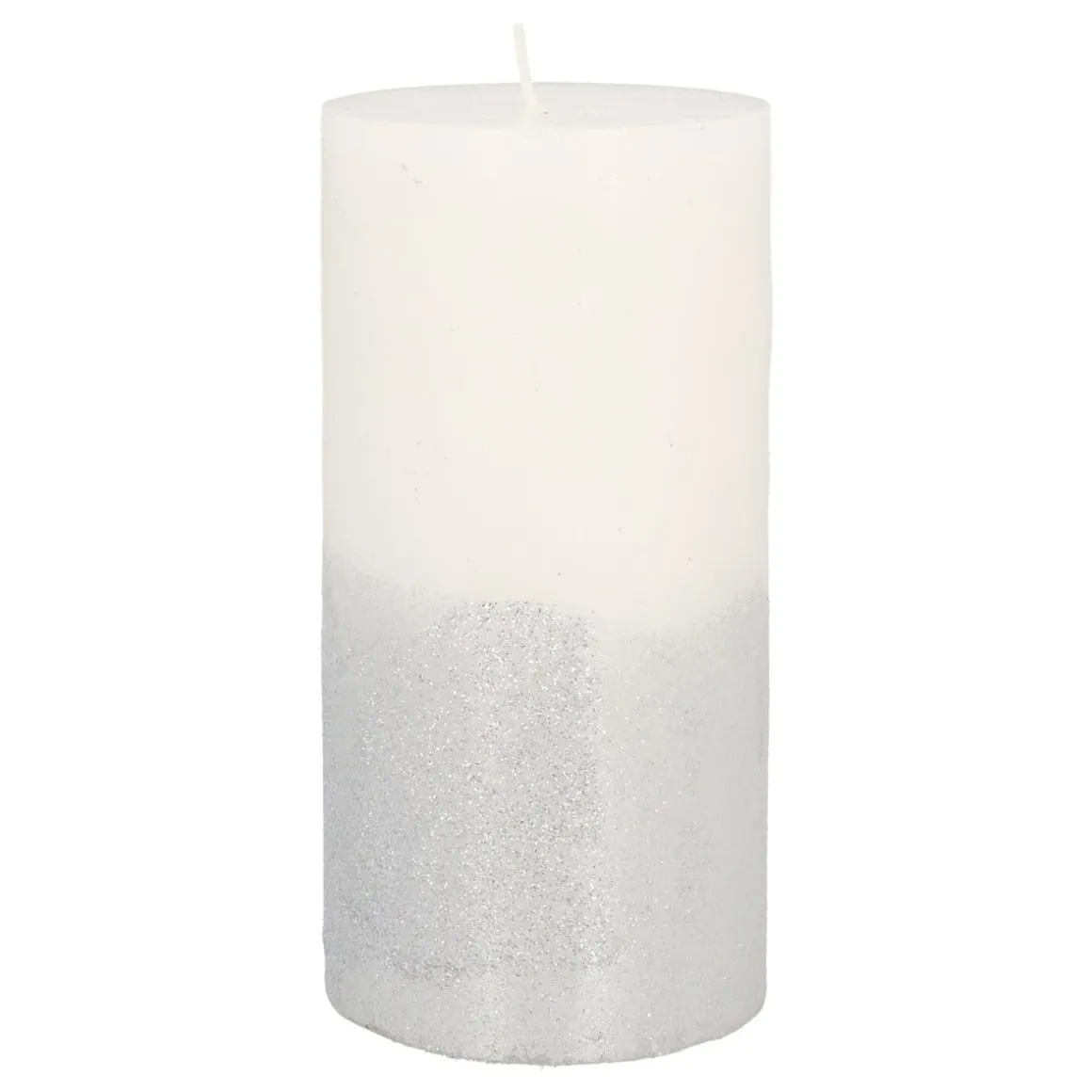 Elegante stompkaars in chique wit, voorzien van zilveren glitter. De kaars is 15 cm hoog en heeft een diameter van 7,5 cm. Een echte eyecatcher.