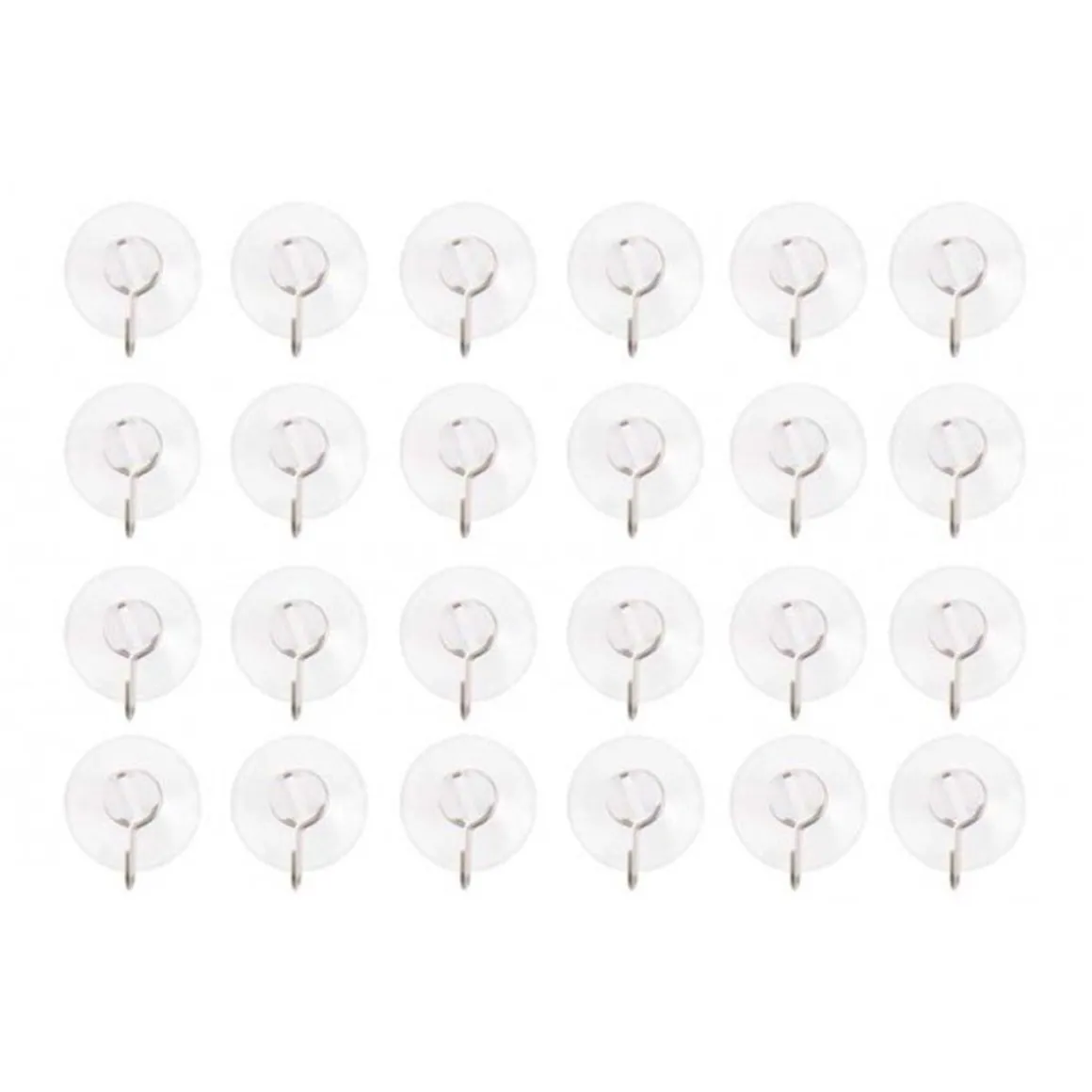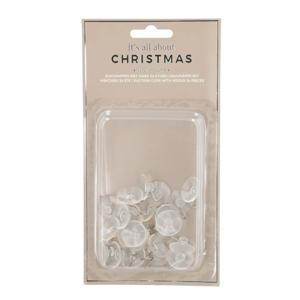 Set van 24 transparante zuignappen met een haakje. De zuignap is 2cm groot en voorzien van een metalen haakje. Ideaal voor het ophangen van verlichting, kersthangers en overige kerstversiering.